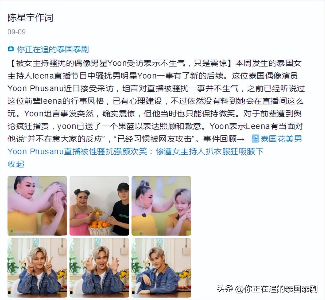【被女主持骚扰的偶像男星Yoon受访表示不生气,只是震惊】本周发生的泰国女主持人leena直播节目中骚扰男明星Yoon一事有了新的后续。这位泰国偶像演员Yoon Phusanu近日接受采访,坦言对直播被骚扰一事并不生气,之前已经听说过这位前辈leena的行事风格,已有心理建设,不过依然没有料到她会在直播间这么玩。Yoon坦言事发突然,确实震惊,但他当时也只能保持微笑。对于前辈遭到舆论疯狂指责,yoon已送了一个果篮以表达照顾和歉意。Yoon表示Leena有当面对他说“并不在意大家的反应”,“已经习惯被网友攻击”。