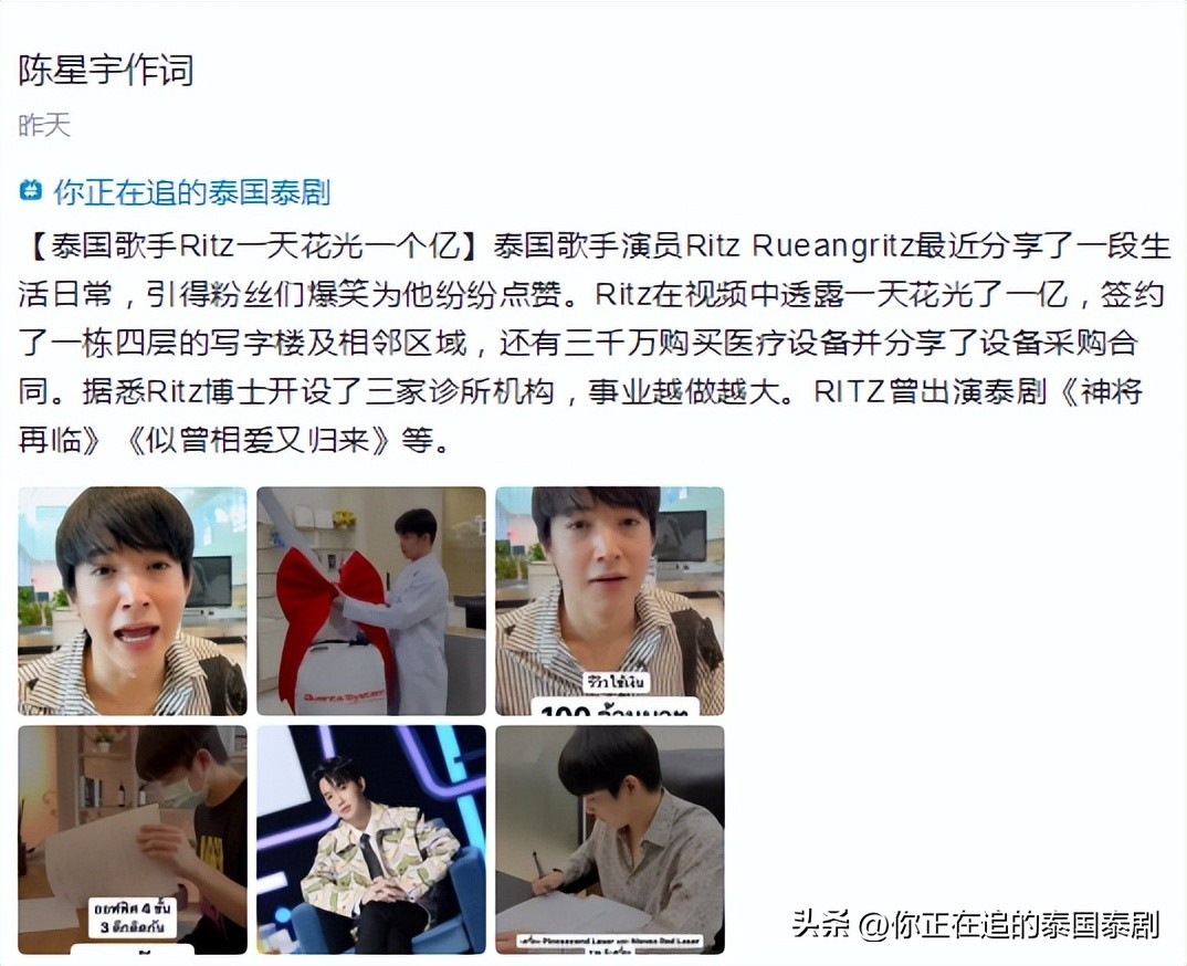【泰国歌手Ritz一天花光一个亿】泰国歌手演员Ritz Rueangritz最近分享了一段生活日常,引得粉丝们爆笑为他纷纷点赞。Ritz在视频中透露一天花光了一亿,签约了一栋四层的写字楼及相邻区域,还有三千万购买医疗设备并分享了设备采购合同。据悉Ritz博士开设了三家诊所机构,事业越做越大。RITZ曾出演泰剧《神将再临》《似曾相爱又归来》等。