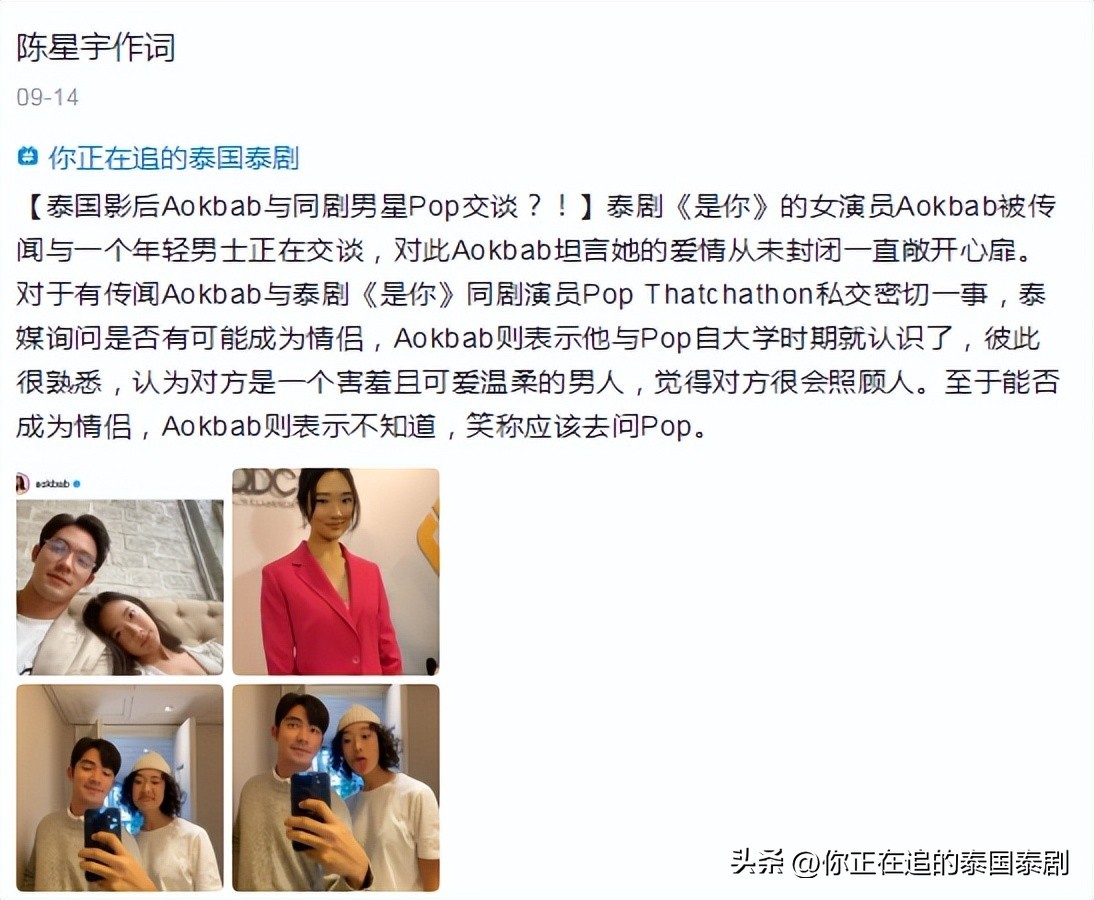【泰国影后Aokbab与同剧男星Pop交谈?!】泰剧《是你》的女演员Aokbab被传闻与一个年轻男士正在交谈,对此Aokbab坦言她的爱情从未封闭一直敞开心扉。对于有传闻Aokbab与泰剧《是你》同剧演员Pop Thatchathon私交密切一事,泰媒询问是否有可能成为情侣,Aokbab则表示他与Pop自大学时期就认识了,彼此很熟悉,认为对方是一个害羞且可爱温柔的男人,觉得对方很会照顾人。至于能否成为情侣,Aokbab则表示不知道,笑称应该去问Pop。