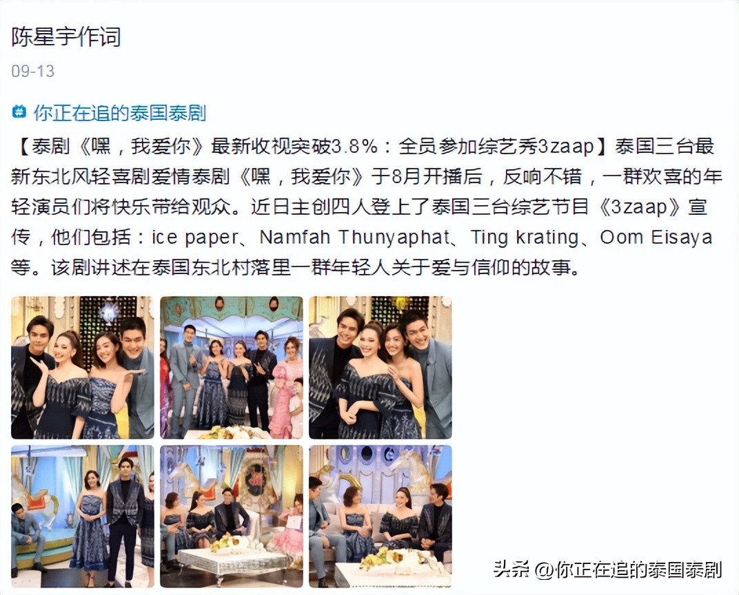 【泰剧《嘿,我爱你》最新收视突破3.8%:全员参加综艺秀3zaap】泰国三台最新东北风轻喜剧爱情泰剧《嘿,我爱你》于8月开播后,反响不错,一群欢喜的年轻演员们将快乐带给观众。近日主创四人登上了泰国三台综艺节目《3zaap》宣传,他们包括:ice paper、Namfah Thunyaphat、Ting krating、Oom Eisaya等。该剧讲述在泰国东北村落里一群年轻人关于爱与信仰的故事。