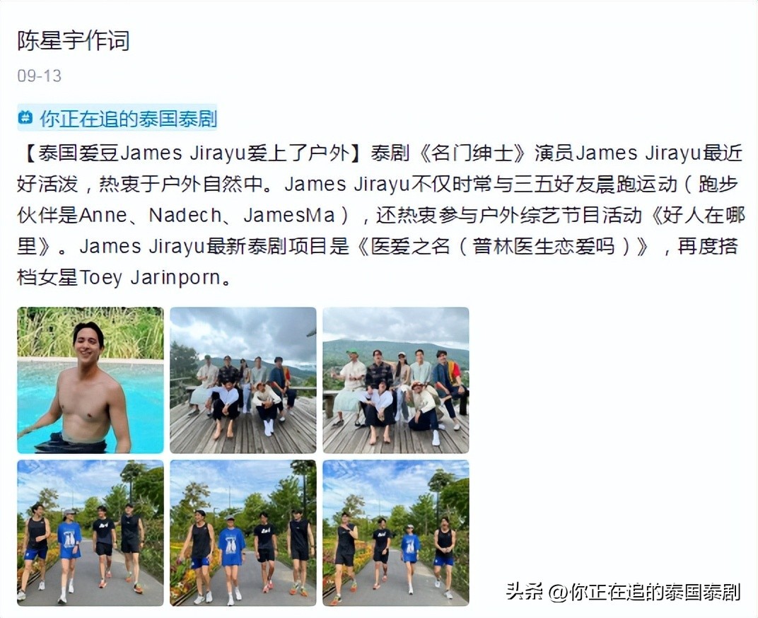 【泰国爱豆James Jirayu爱上了户外】泰剧《名门绅士》演员James Jirayu最近好活泼,热衷于户外自然中。James Jirayu不仅时常与三五好友晨跑运动(跑步伙伴是Anne、Nadech、JamesMa),还热衷参与户外综艺节目活动《好人在哪里》。James Jirayu最新泰剧项目是《医爱之名(普林医生恋爱吗)》,再度搭档女星Toey Jarinporn。