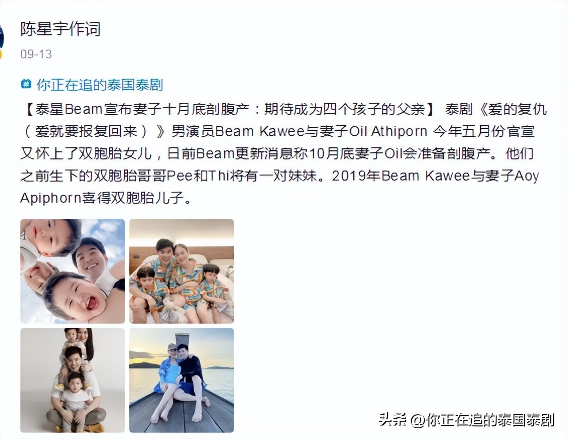 【泰星Beam宣布妻子十月底剖腹产:期待成为四个孩子的父亲】 泰剧《爱的复仇(爱就要报复回来) 》男演员Beam Kawee与妻子Oil Athiporn 今年五月份官宣又怀上了双胞胎女儿,日前Beam更新消息称10月底妻子Oil会准备剖腹产。他们之前生下的双胞胎哥哥Pee和Thi将有一对妹妹。2019年Beam Kawee与妻子Aoy Apiphorn喜得双胞胎儿子。