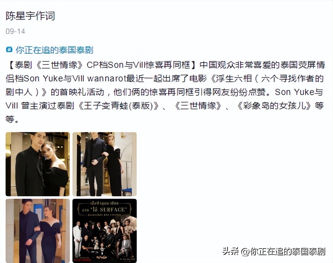 【泰剧《三世情缘》CP档Son与Vill惊喜再同框】中国观众非常喜爱的泰国荧屏情侣档Son Yuke与Vill wannarot最近一起出席了电影《浮生六相(六个寻找作者的剧中人)》的首映礼活动,他们俩的惊喜再同框引得网友纷纷点赞。Son Yuke与Vill 曾主演过泰剧《王子变青蛙(泰版)》、《三世情缘》、《彩象岛的女孩儿》等等。