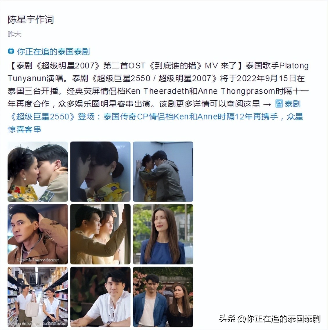 【泰剧《超级明星2007》第二首OST《到底谁的错》MV 来了】泰国歌手Platong Tunyanun演唱。泰剧《超级巨星2550 / 超级明星2007》将于2022年9月15日在泰国三台开播。经典荧屏情侣档Ken Theeradeth和Anne Thongprasom时隔十一年再度合作,众多娱乐圈明星客串出演。