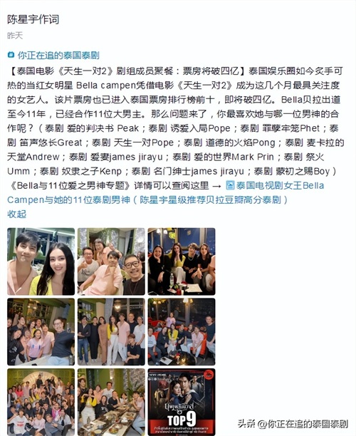 【泰国电影《天生一对2》剧组成员聚餐:票房将破四亿】泰国娱乐圈如今炙手可热的当红女明星 Bella campen凭借电影《天生一对2》成为这几个月最具关注度的女艺人。该片票房也已进入泰国票房排行榜前十,即将破四亿。Bella贝拉出道至今11年,已经合作11位大男主。那么问题来了,你最喜欢她与哪一位男神的合作呢?(泰剧 爱的判决书 Peak;泰剧 诱爱入局Pope;泰剧 罪孽牢笼Phet;泰剧 笛声悠长Great;泰剧 天生一对Pope;泰剧 道德的火焰Pong;泰剧 麦卡拉的天堂Andrew;泰剧 爱妻james jirayu;泰剧 爱的世界Mark Prin;泰剧 祭火Umm;泰剧 奴隶之子Kenp;泰剧 名门绅士james jirayu;泰剧 蒙初之赐Boy)