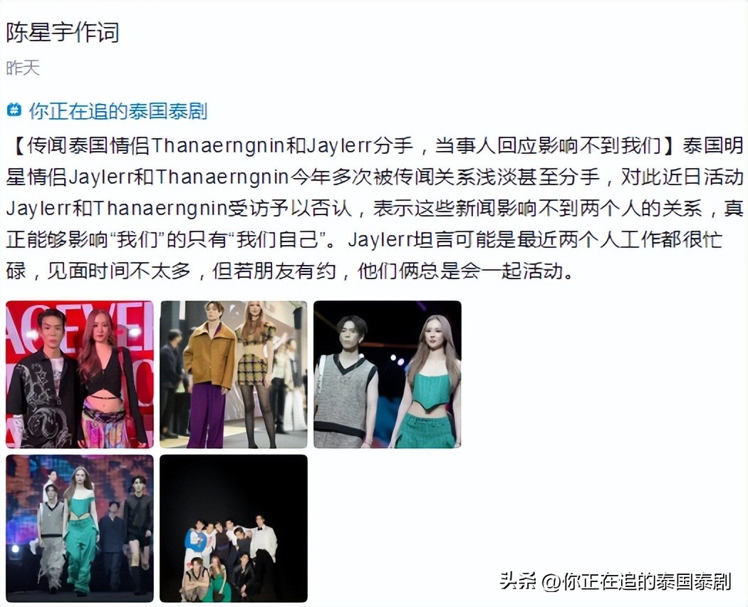 【传闻泰国情侣Thanaerngnin和Jaylerr分手,当事人回应影响不到我们】泰国明星情侣Jaylerr和Thanaerngnin今年多次被传闻关系浅淡甚至分手,对此近日活动Jaylerr和Thanaerngnin受访予以否认,表示这些新闻影响不到两个人的关系,真正能够影响“我们”的只有“我们自己”。Jaylerr坦言可能是最近两个人工作都很忙碌,见面时间不太多,但若朋友有约,他们俩总是会一起活动。