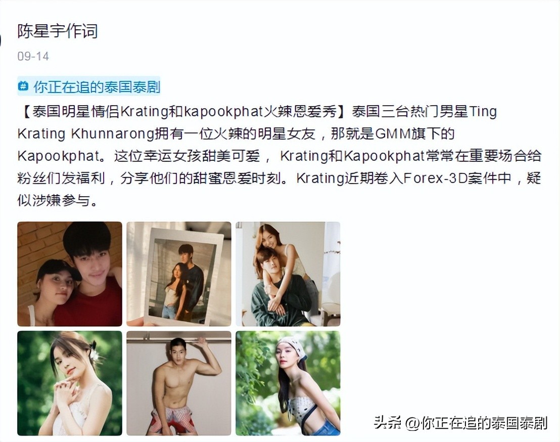 【泰国明星情侣Krating和kapookphat火辣恩爱秀】泰国三台热门男星Ting Krating Khunnarong拥有一位火辣的明星女友,那就是GMM旗下的Kapookphat。这位幸运女孩甜美可爱, Krating和Kapookphat常常在重要场合给粉丝们发福利,分享他们的甜蜜恩爱时刻。Krating近期卷入Forex-3D中,疑似涉嫌参与。