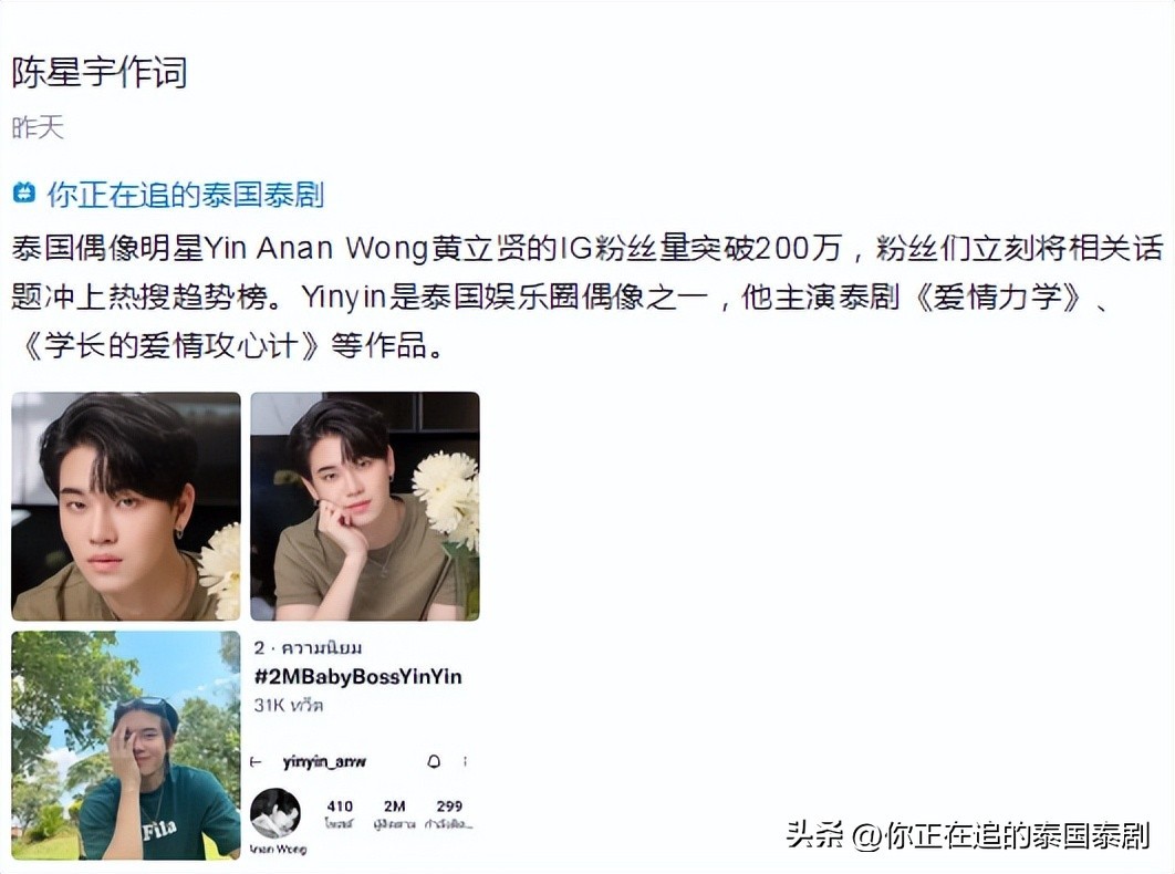 泰国偶像明星Yin Anan Wong黄立贤的IG粉丝量突破200万,粉丝们立刻将相关话题冲上热搜趋势榜。Yinyin是泰国娱乐圈偶像之一,他主演泰剧《爱情力学》、《学长的爱情攻心计》等作品。