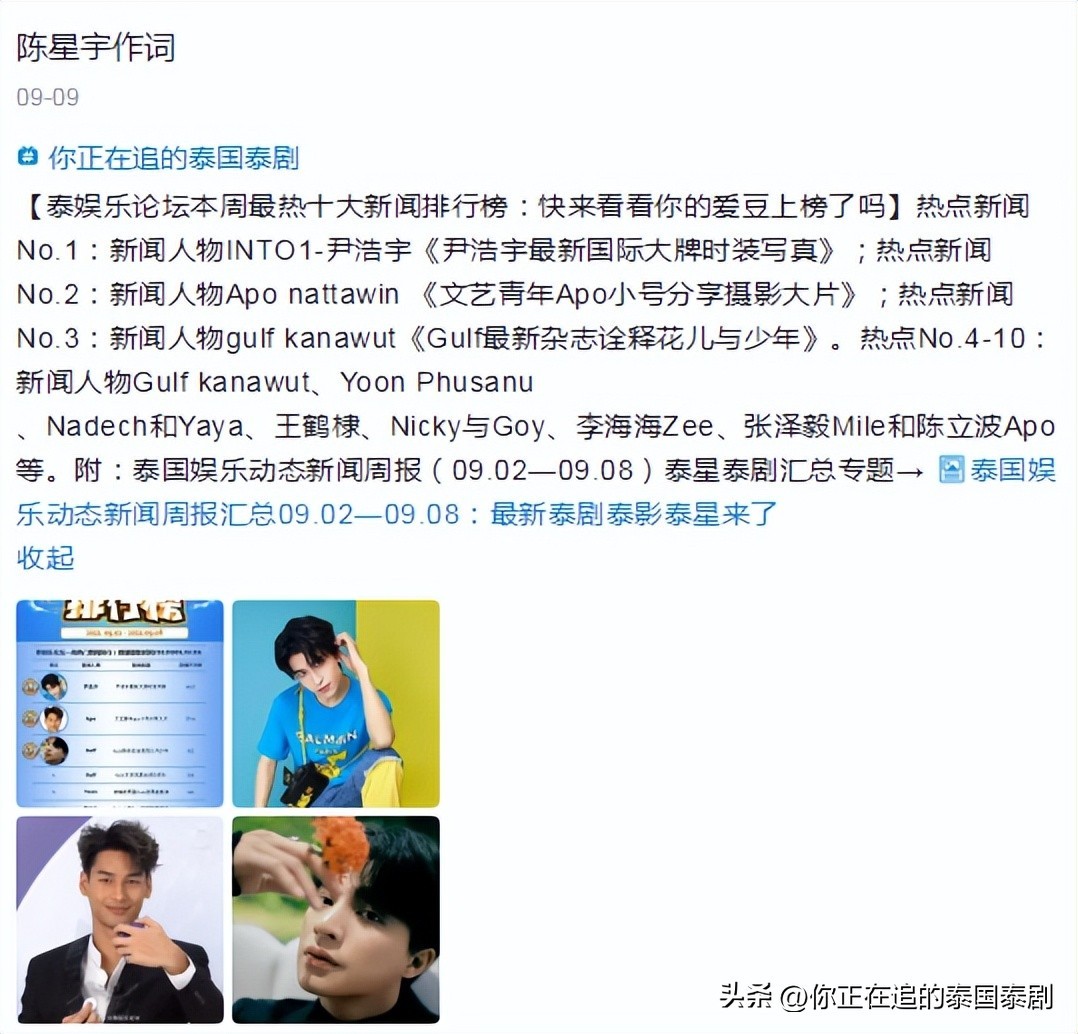 【泰娱乐论坛本周(09.02-09.08)最热十大新闻排行榜:快来看看你的爱豆上榜了吗】热点新闻No.1:新闻人物INTO1-尹浩宇《尹浩宇最新国际大牌时装写真》;热点新闻No.2:新闻人物Apo nattawin 《文艺青年Apo小号分享摄影大片》;热点新闻No.3:新闻人物gulf kanawut《Gulf最新杂志诠释花儿与少年》。热点No.4-10:新闻人物Gulf kanawut、Yoon Phusanu 、Nadech和Yaya、王鹤棣、Nicky与Goy、李海海Zee、张泽毅Mile和陈立波Apo等。