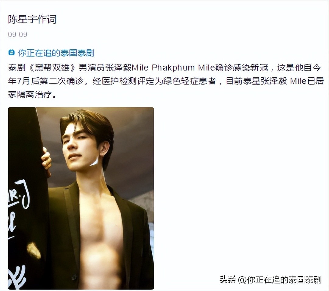 泰剧《黑帮双雄》男演员张泽毅Mile Phakphum Mile确诊感染新冠,这是他自今年7月后第二次确诊。经医护检测评定为绿色轻症患者,目前泰星张泽毅 Mile已居家隔离治疗。