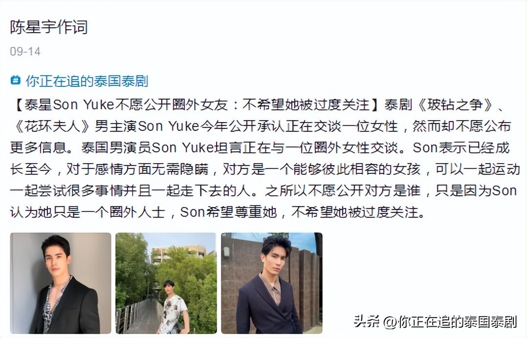 【泰星Son Yuke不愿公开圈外女友:不希望她被过度关注】泰剧《玻钻之争》、《花环夫人》男主演Son Yuke今年公开承认正在交谈一位女性,然而却不愿公布更多信息。泰国男演员Son Yuke坦言正在与一位圈外女性交谈。Son表示已经成长至今,对于感情方面无需隐瞒,对方是一个能够彼此相容的女孩,可以一起运动一起尝试很多事情并且一起走下去的人。之所以不愿公开对方是谁,只是因为Son认为她只是一个圈外人士,Son希望尊重她,不希望她被过度关注。