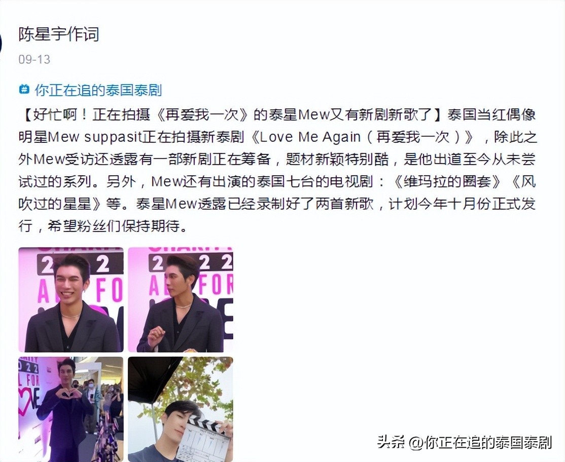 【好忙啊!正在拍摄《再爱我一次》的泰星Mew又有新剧新歌了】泰国当红偶像明星Mew suppasit正在拍摄新泰剧《Love Me Again(再爱我一次)》,除此之外Mew受访还透露有一部新剧正在筹备,题材新颖特别酷,是他出道至今从未尝试过的系列。另外,Mew还有出演的泰国七台的电视剧:《维玛拉的圈套》《风吹过的星星》等。泰星Mew透露已经录制好了两首新歌,计划今年十月份正式发行,希望粉丝们保持期待。