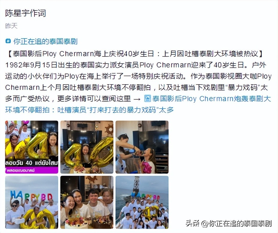 【泰国影后Ploy Chermarn海上庆祝40岁生日:上月因吐槽泰剧大环境被热议】1982年9月15日出生的泰国实力派女演员Ploy Chermarn迎来了40岁生日。户外运动的小伙伴们为Ploy在海上举行了一场特别庆祝活动。作为泰国影视圈大咖Ploy Chermarn上个月因吐槽泰剧大环境不停翻拍,以及吐槽当下戏剧里“暴力戏码”太多而广受热议