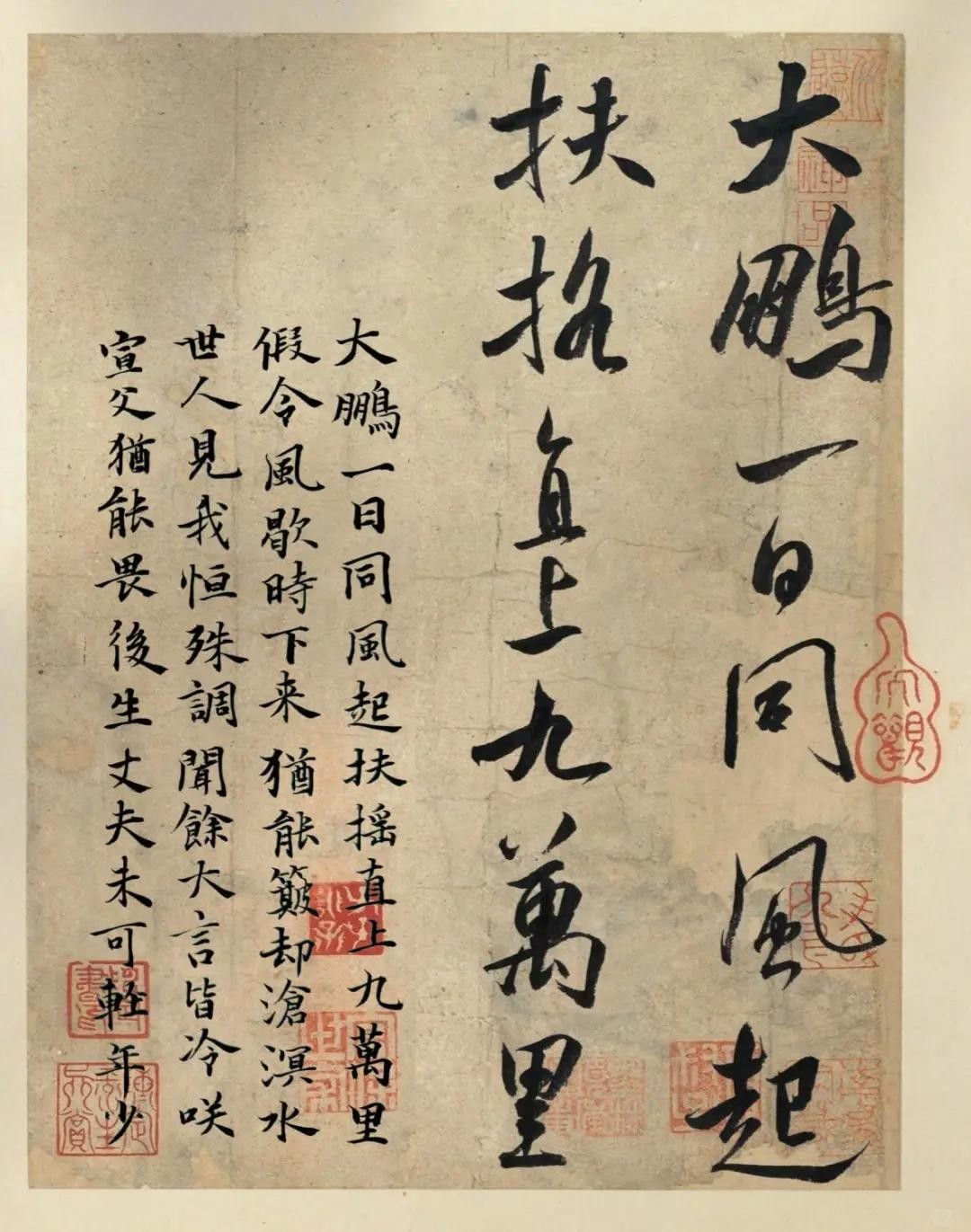 大鹏是李白诗赋中常常借以自况的意象,它既是自由的象征,又是惊世骇俗的理想和志趣的象征。开元十三年(725年),青年李白出蜀漫游,在江陵遇见名道士司马承祯,司马称李白“有仙风道骨焉,可与神游八极之表”,李白当即作《大鹏遇希有鸟赋并序》(后改为《大鹏赋》),自比为庄子《逍遥游》中的大鹏鸟。