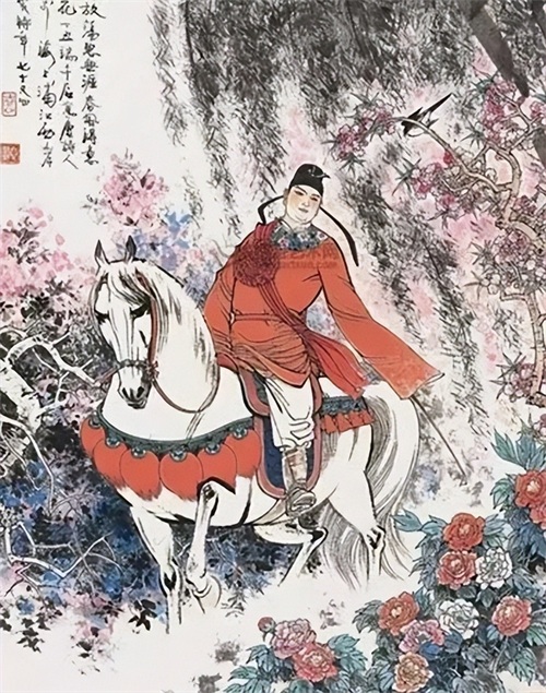 孟郊两次落第,这次竟然高中鹄的,颇出意料。这就仿佛像是从苦海中一下子被超度出来,登上了欢乐的峰顶;眼前天宇高远,大道空阔,似乎只待他四蹄生风了。“春风得意马蹄疾,一日看尽长安花”,活灵活现地描绘出诗人神采飞扬的得意之态,酣畅淋漓地抒发了他心花怒放的得意之情。这两句神妙之处,在于情与景会,意到笔到,将诗人策马奔驰于春花烂漫的长安道上的得意情景,描绘得生动鲜明。
