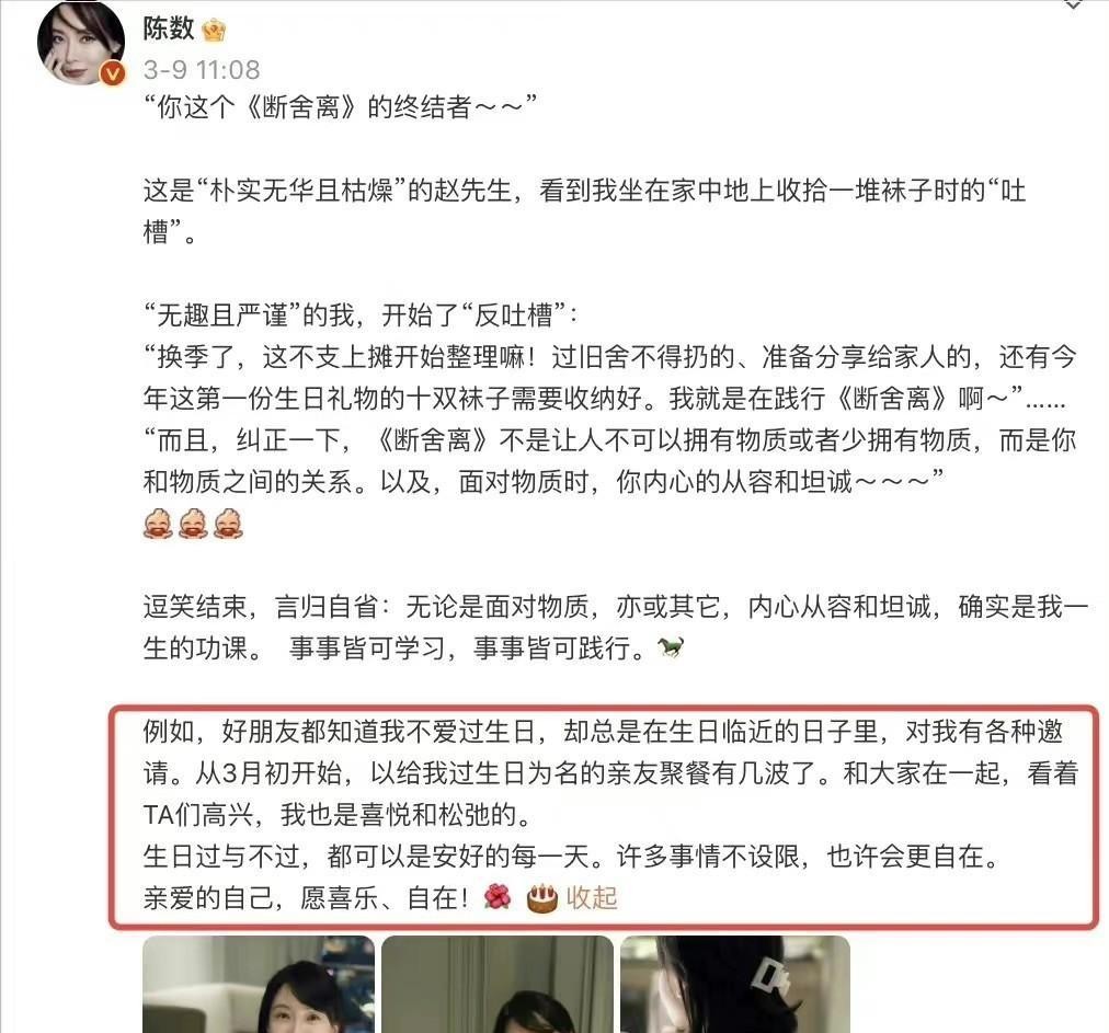 3月9日,陈数46岁生日时,她在社交平台分享了和赵胤胤的生活日常。