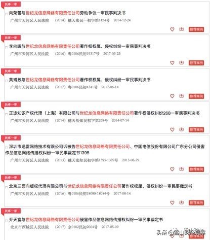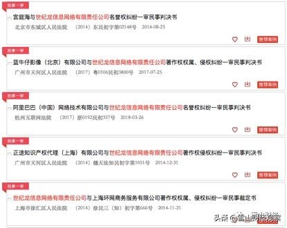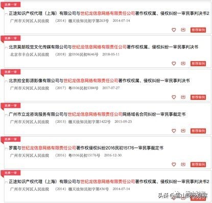 据初步统计,世纪龙信息网络有限公司所涉及诉讼,约90%为原告诉其著作权侵权,还有至少2起劳动争议诉讼,至少3起名誉权诉讼。原告中不乏大名鼎鼎的阿里巴巴和人民网。