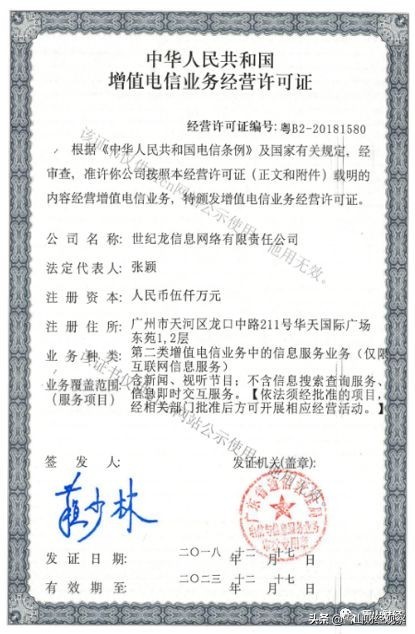 根据国家企业信用信息公示系统,世纪龙信息网络有限责任公司的经营范围为“在广东省范围内提供因特网接入服务;信息服务业务(仅限互联网信息服务,含电子公告服务);虚拟主机服务、主机托管服务;系统集成、项目咨询服务;电脑软件产品的开发与销售等”,并未包括接收和处理网络投诉或类似业务。