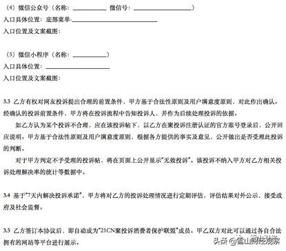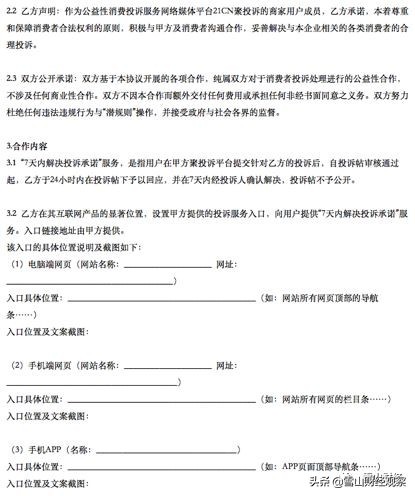 3.2 乙方在其互联网产品的显著位置,设置甲方提供的投诉服务入口,向用户提供“7天内解决投诉承诺”服务。入口链接地址由甲方提供。