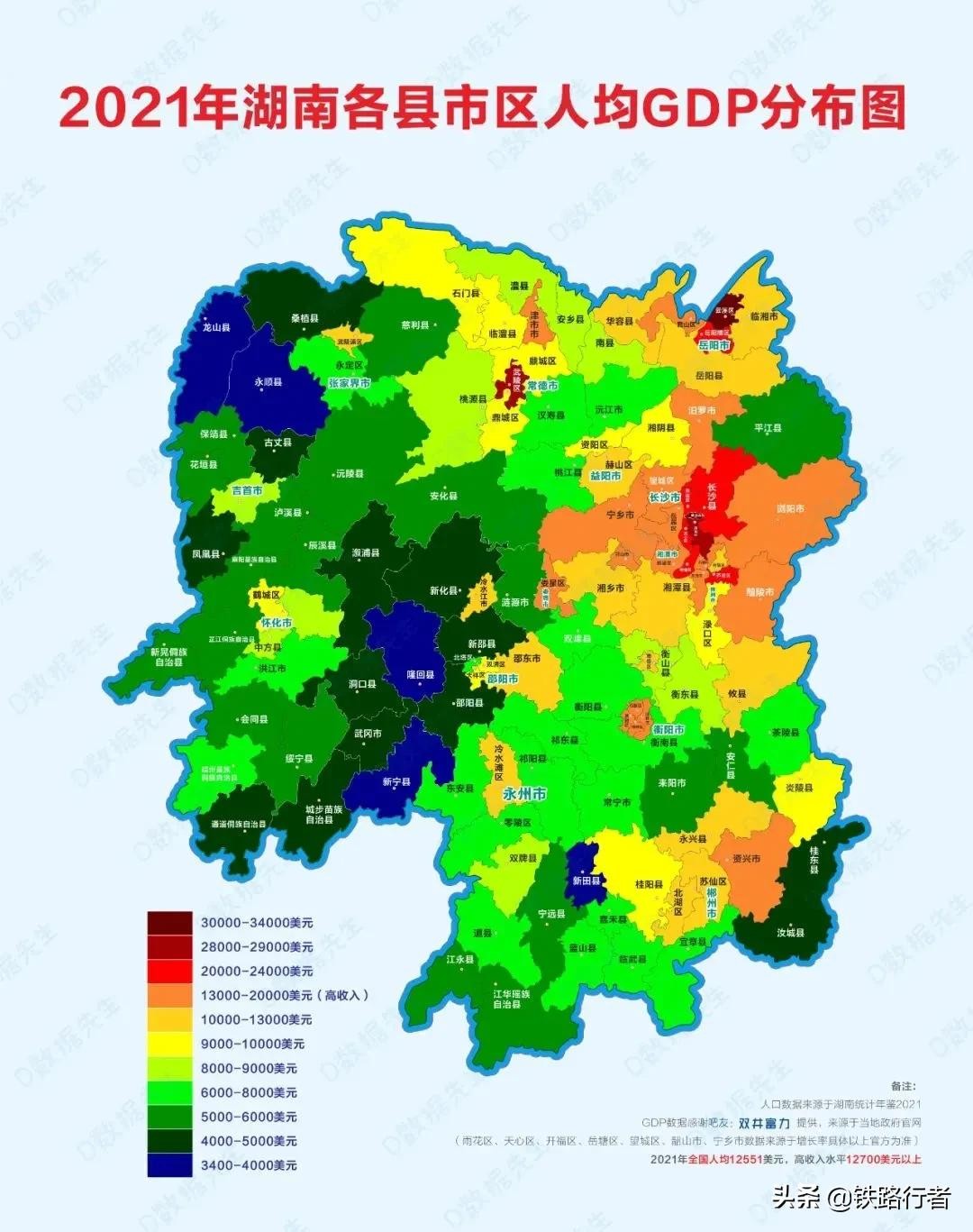 然而看了湖南各县市区人均生产总值(人均GDP)分布图,会有一个令人惊讶的发现,那就是湖南最落后的区域不是湘西,而是湘西南?