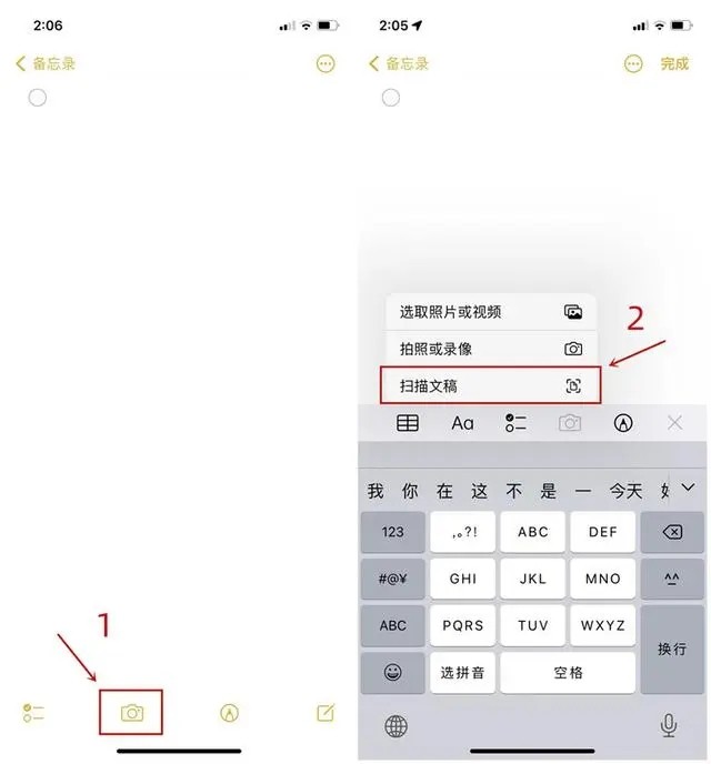 打开手机中的备忘录,然后点击下方的相机图标,接着在跳出来的界面中点击“扫描文稿”选项,然后点击圆圈扫描所需文档,扫描完成后将其导出即可;