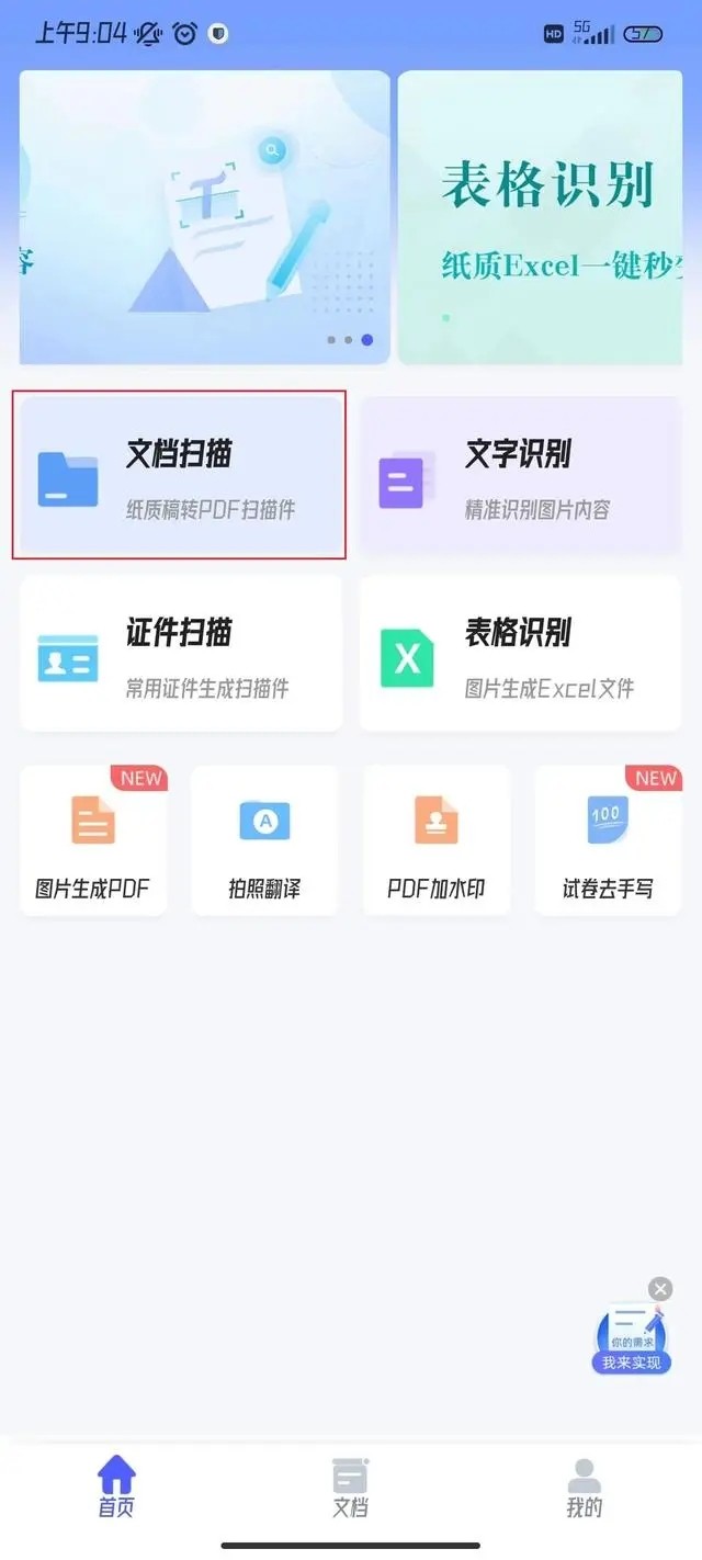 1、首先需要在自己的手机上安装好“风云扫描王”软件,然后将其打开,注册后登录进入首页,点击【文档扫描】功能并进入;