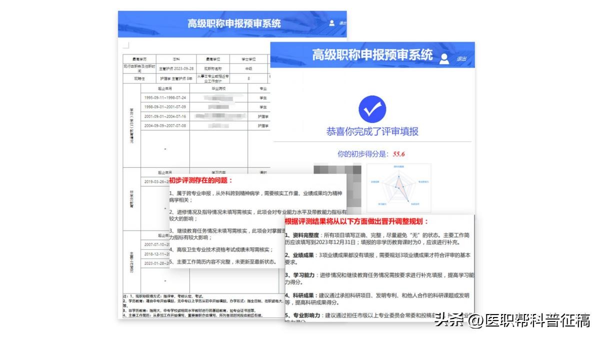 预审系统真实还原广东省卫生高级职称网上申报系统,严格按照省评系统标准,审核每一项信息,并提供审核报告及优化建议,并提供详尽的指导和实时答疑解惑。避免后期评审时,才发现各种材料不符合要求,而被迫延期申报职称的情况。