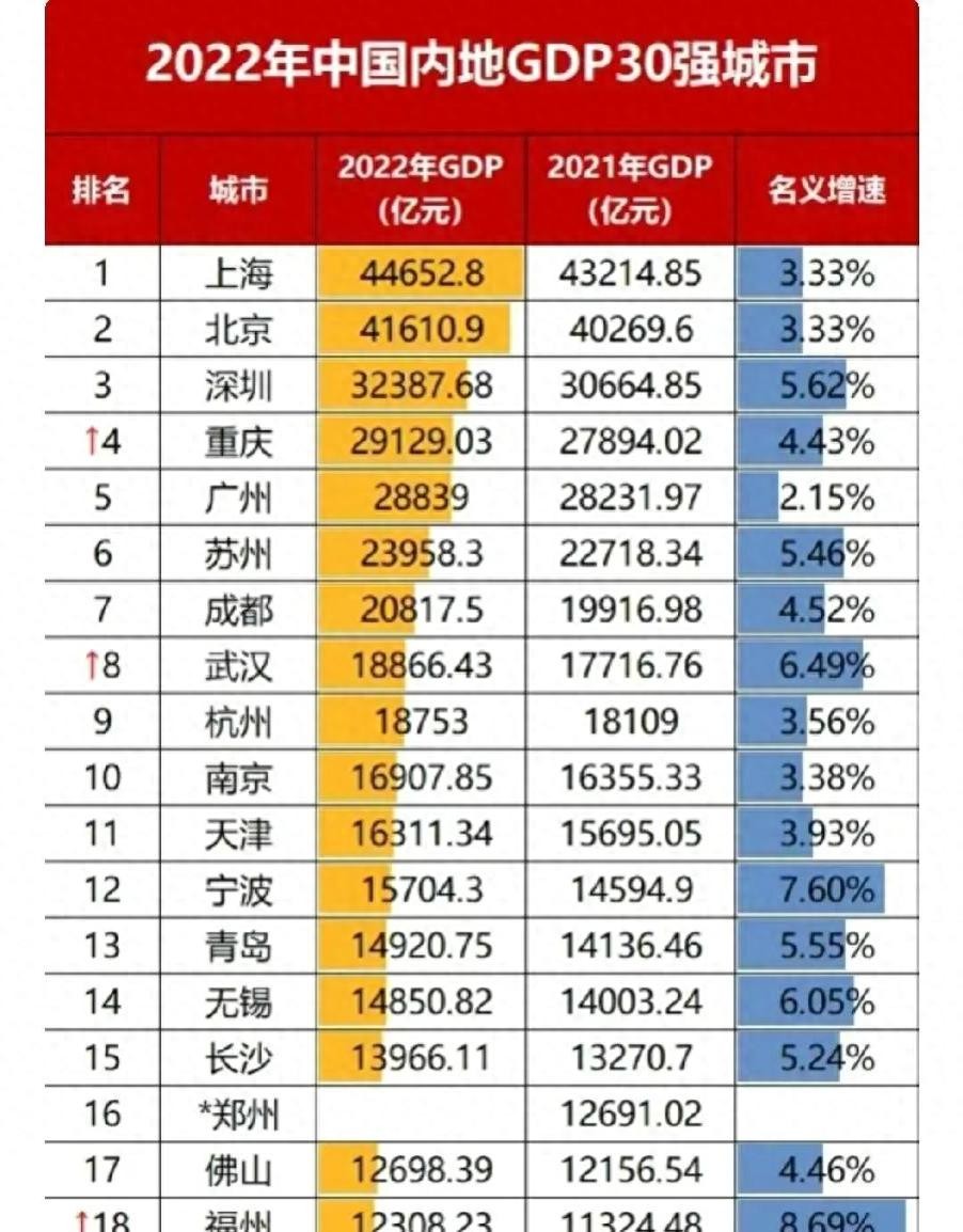 这其中还有重庆以2.9万亿元的GDP位列第四,而广州则以2.8万亿元的GDP位列第五。