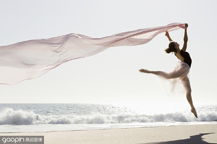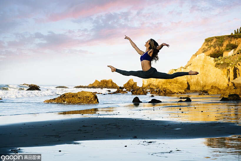 拍照时想要拍出独特的照片不仅需要道具,还需要别出心裁的动作。图为一名舞者在空中做了一个大跳,也就是我们常说的空中劈叉,结合大海沙滩的背景将这一刻定格在画面上,这种瞬时拍摄也能拍出好看的照片。