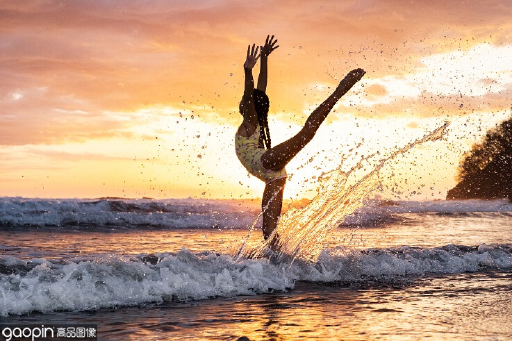 倘若你出门仓促忘记带纱布,那也没关系,我们可以借助海水拍出时尚大片。图中的女生一只脚站在浅海水域,另一只脚与一股飞扬的海水平行,这可不是什么巧合,只是利用的惯性原理。两只脚同时站在水里,海浪来临时,一只脚带着海水奋力划出水面,另一只脚作为身体的支撑点就可以完成图中的动作啦。