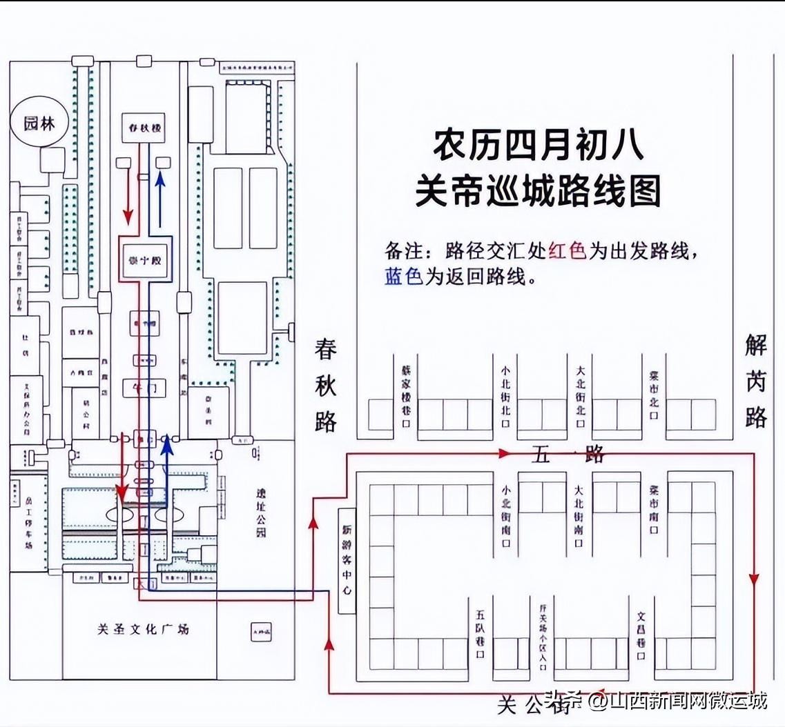 路 线:崇宁殿敬神→春秋楼迎神→崇宁殿前→崇宁殿月台西台阶下→至香炉前→御书楼→午门→雉门→端门→影壁西侧→结义园西侧忠义道至入口处→春秋路→五一路(沿街)→解州东门口→解芮路→关公街→春秋路→广场主道→入口处→沿结义园东侧忠义道→崇宁殿前→春秋楼安神