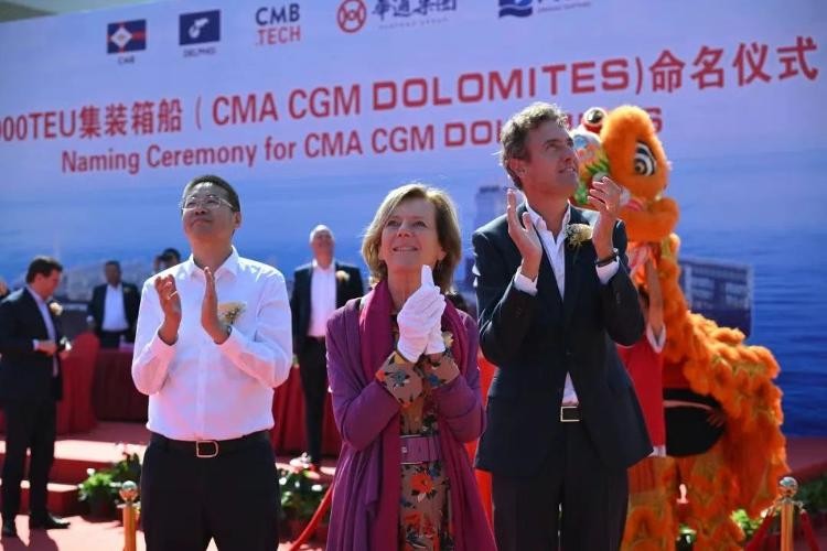 Catherine Verbeke女士作为教母将新船命名为“CMA CGM DOLOMITES”轮。她在CMB公司首席执行官Alexander Saverys和华通集团副总经理孙明铭陪同下,为新船行“掷瓶礼”并送上美好祝福。