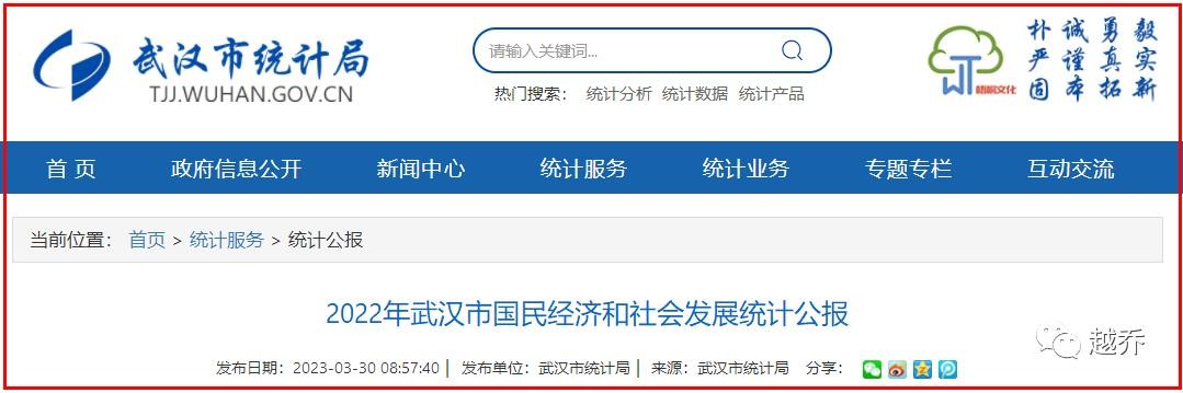 【越乔】获悉,3月30日,武汉统计局发布:《2022年武汉市国民经济和社会发展统计公报》。