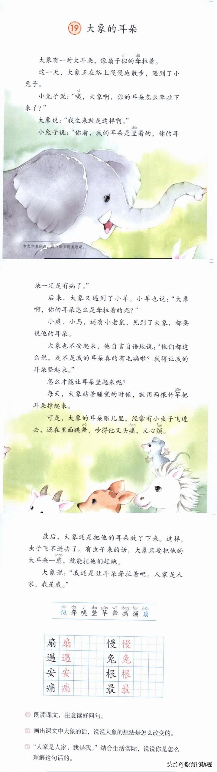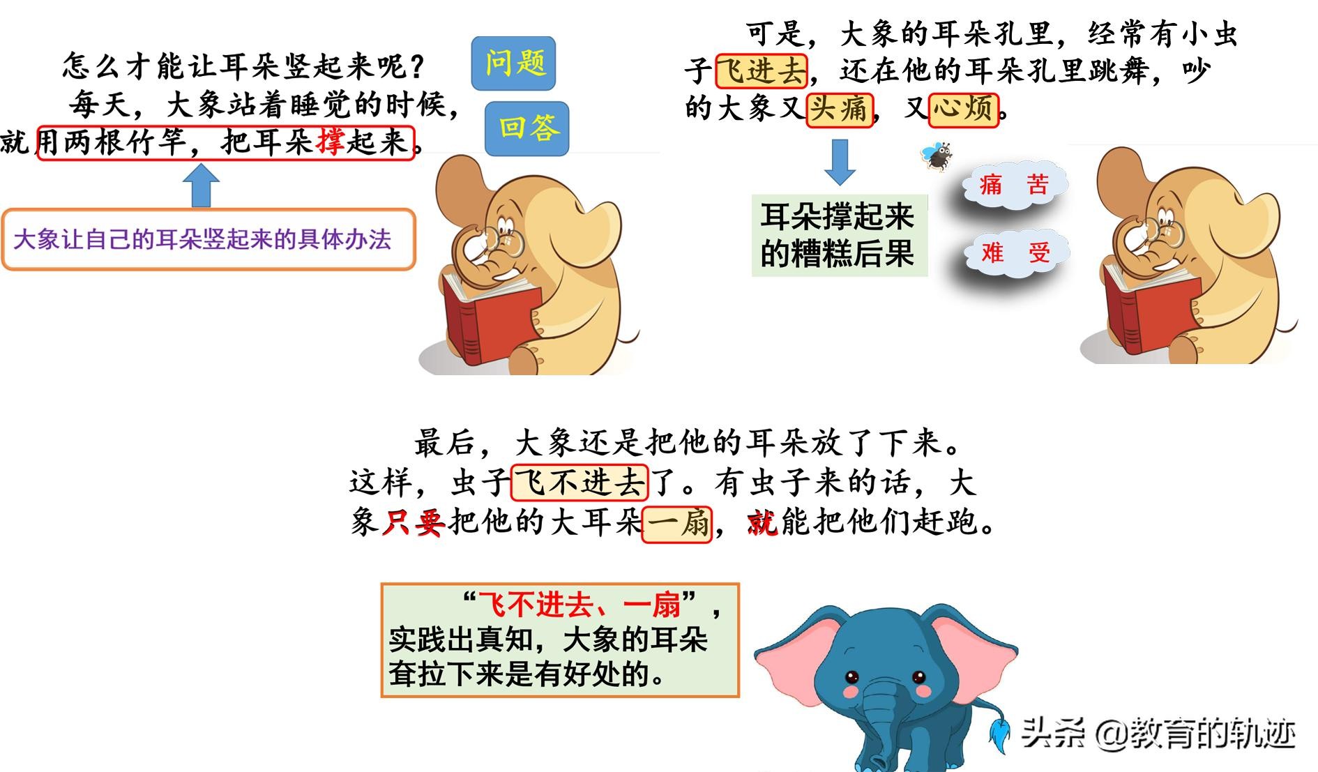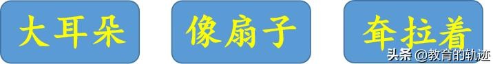 大象有一对大耳朵,像扇子似的耷拉着。【比喻句,把大象的耳朵比作大扇子,形象具体。】