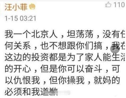 在外出差应酬结束的时候在当地遭到了不平等待遇。起因是在当地因为讲北京话,喝酒不便开车选择搭乘出租车,却被司机骂脏话。之后汪小菲跟该司机理论。两人在街头发生争吵。