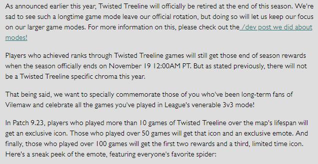 当本赛季于11月19日12:00AM正式结束时,位列扭曲丛林前列的玩家们依然可以获得该赛季末的奖励。但也正如前文所述,今年不再会有扭曲丛林的炫彩皮肤相送。