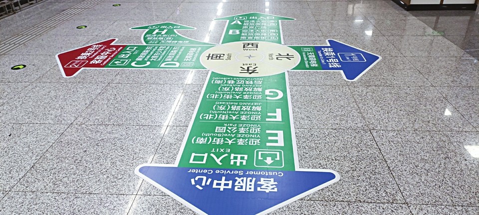 大南门站站厅层地面上清晰地标注着出入口道路指引及换乘车标识。山西晚报记者 薛建英 摄