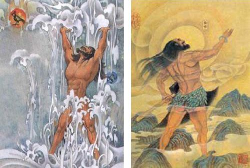 盘古临死前化作天地万物。他呼出的气体变成了风云,发出的声音变成了雷霆;左眼变成了太阳,右眼变成了月亮,头发和胡须变成了星星;四脚五体变成了大地的四极和五岳名山;血液变成了江河;牙齿、骨骼和骨髓变成了地下矿藏;皮肤和汗毛变成了大地上的草木;汗水变成了雨露,而盘古最重要的精灵魂魄则在他死后变成了人类。