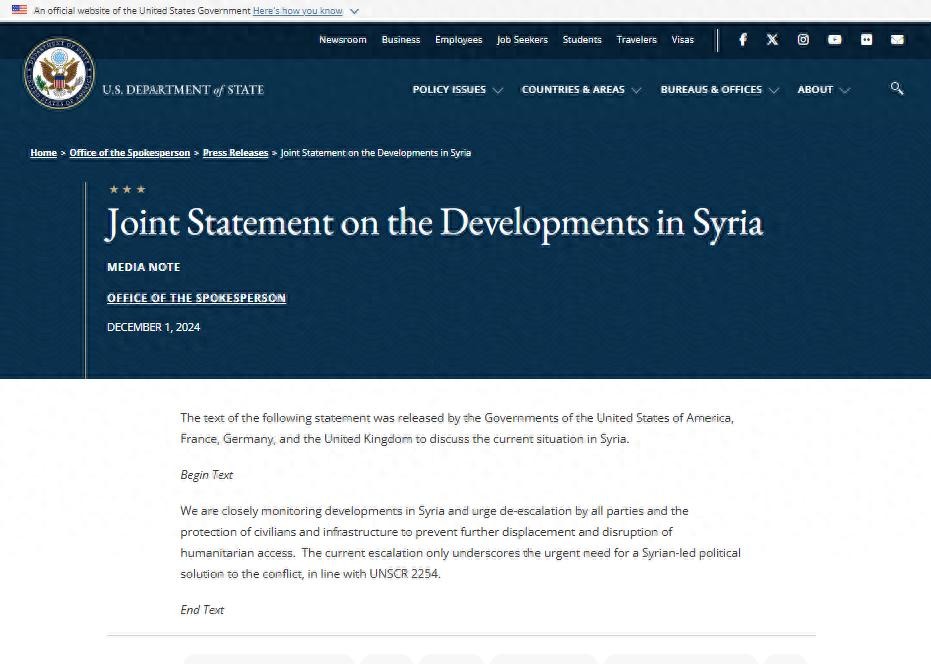 美德法英四国发表联合声明 呼吁冲突各方缓和叙利亚局势
