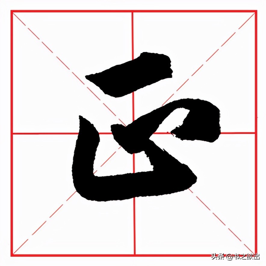 首横起笔露锋轻入,然后向右抗肩上行,左轻右重,不要写长;竖笔位于横画的中间稍偏左处与横画半虚接起笔,坚定有力,略左斜;右边小横位于竖画的中部从竖画里面实接起笔,抗肩与上横一致,收笔略长于上横;左边竖画起笔与小横的起笔平齐,且重心与上横的起笔对应,角度略平,向下略轻,稍带弧度;下横略长,起笔左探,左边抗肩角度稍大,过中竖后行笔渐平,收笔稍下压,略呈拱形,以平稳整字,三个横画间距相等。