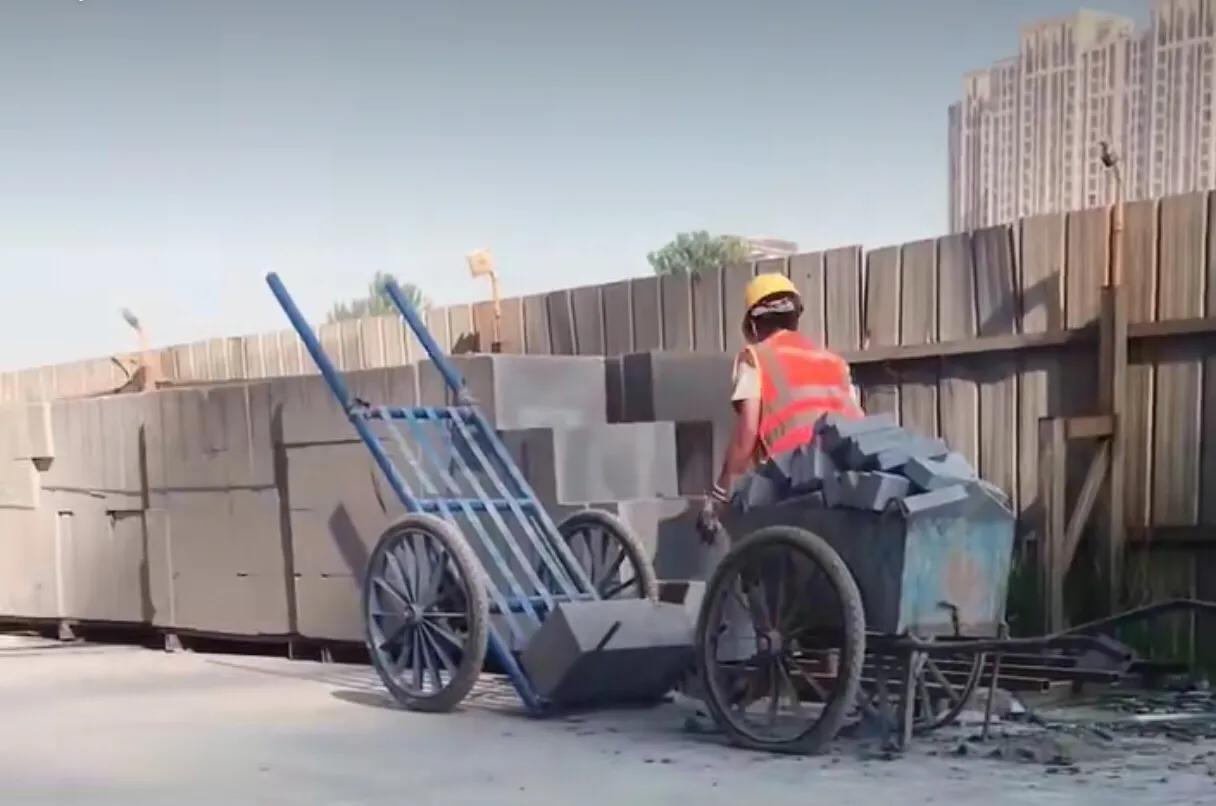 一块大砖重量大概在30斤左右。我们的工资一天330块钱左右。如果一个月不休息的话可以挣到1万块钱。这种活比较脏也比较累,一般干这种工作的都是我们农村的80后90后为主!