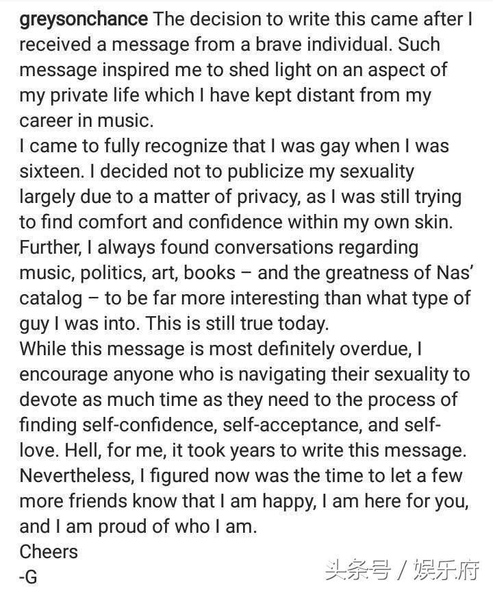 格雷森·蔡斯(Greyson Chance)1997年生人,曾经上过《快乐大本营》,那会还是个15岁的小男孩,现在也已经长大了。而今天,他在ins上出柜了。
