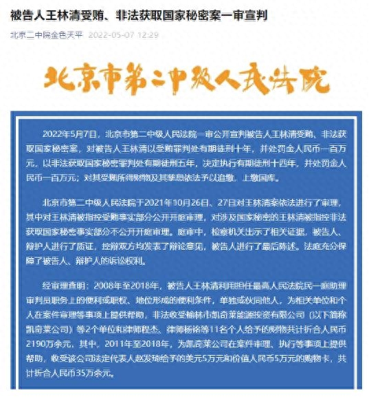 此前的5月7日,北京市第二中级人民法院一审公开宣判,王林清受贿、非法获取国家秘密案一审宣判,决定执行有期徒刑十四年,并处罚金人民币一百万元;对其受贿所得财物及其孳息依法予以追缴,上缴国库。