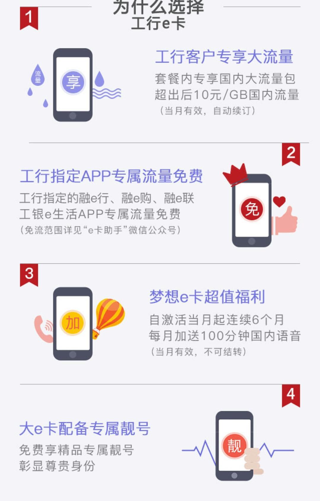 小e卡月费19元套餐内含有2GB国内流量,前六个月加送100分钟国内免费通话,工行指定APP免流,并且超出10/GB,统统为国内流量啊,出差人士必备啊。