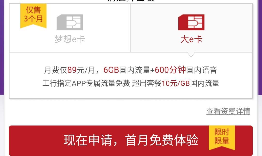 大e卡月费89元,6GB国内流量外加600分钟国内语音,工行指定APP免流,超出部分10/GB,同时开通6个月连续赠送100分钟国内通话,超大超爽,给你最佳的体验。