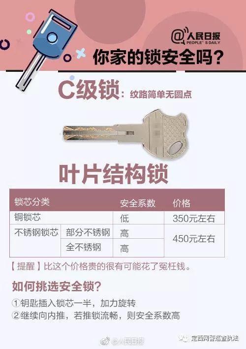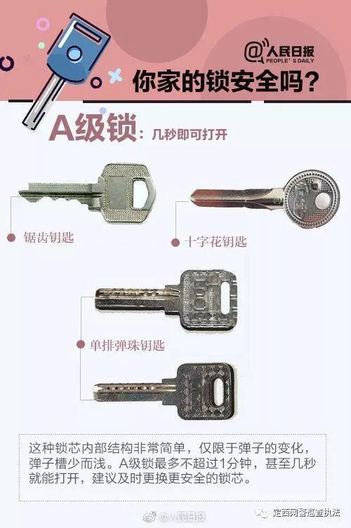 ①A级锁锁芯内部结构非常简单,最多不超过1分钟,甚至几秒就能打开;②B级锁比A级锁复杂,但防止技术开锁时间也只有5分钟左右;③弹珠结构的锁,用一把掏耳勺,毫无经验的人也能在10秒之内开锁。为了安全,请及时将锁芯换成C级锁!