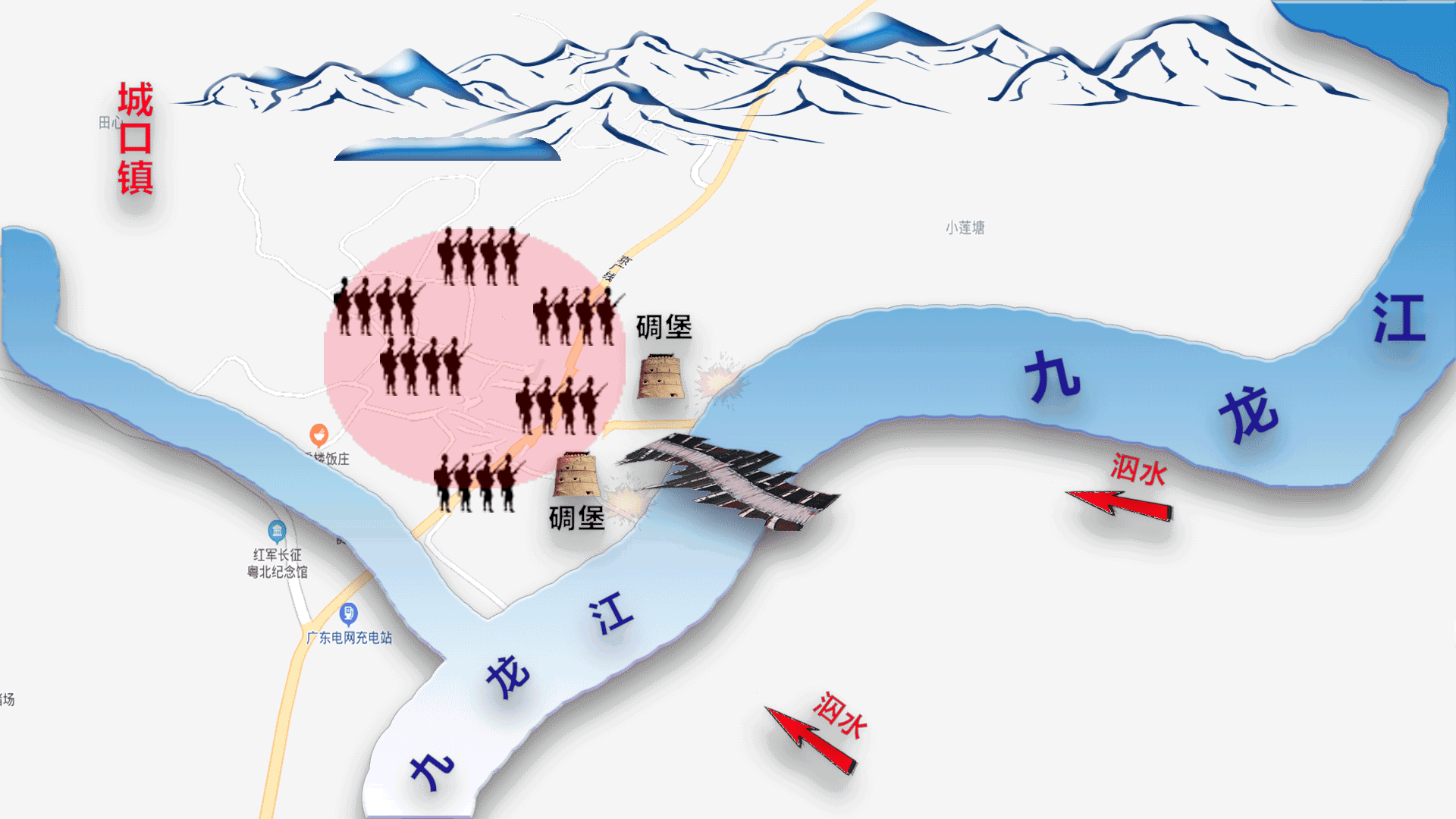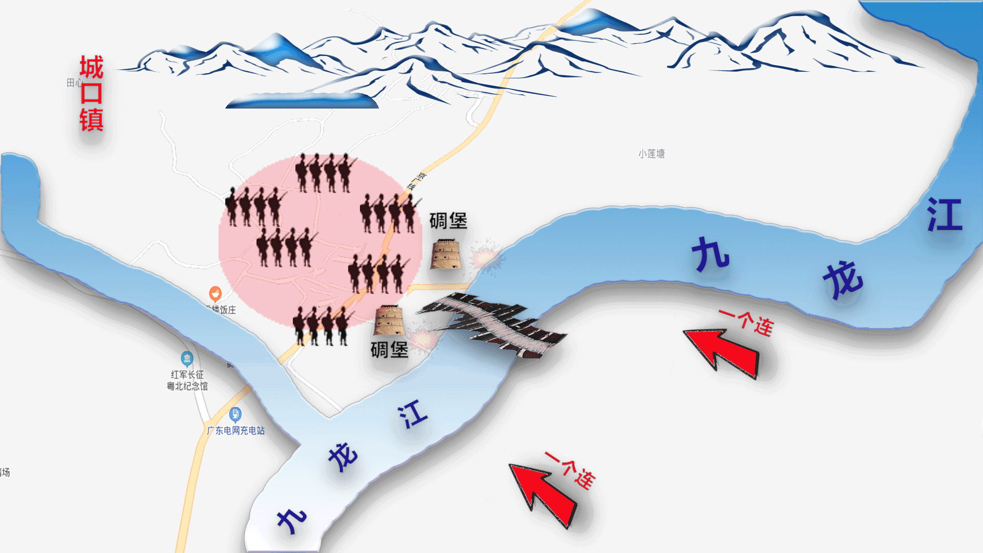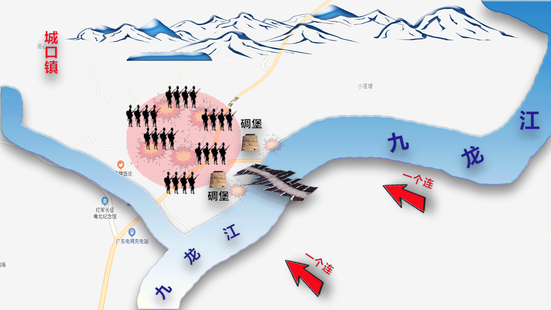 第二封锁线的重镇广东仁化县城口镇是个隘口,是第二封锁线的军事重镇,南面的粤军严阵以待,北面是无路的大山,这里是红军西进的唯一通道。情报说,城口镇内没有粵军防守,只有几百人的民团。1934年11月,红军突破老蒋设置的第二道封锁线,就是从袭击城口镇开始的。这是一个被几条河渠环抱着的小镇,镇前有一座木桥,要想占领镇子必须从桥上过去。