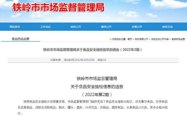 据通告,按照食品安全抽检计划部署安排,市场监督管理部门组织完成了食品安全抽检95批次,涉及餐饮食品、炒货食品及坚果制品、淀粉及淀粉制品、糕点、罐头、酒类、冷冻饮品、肉制品、蔬菜制品、水果制品10大类,其中合格95批次。