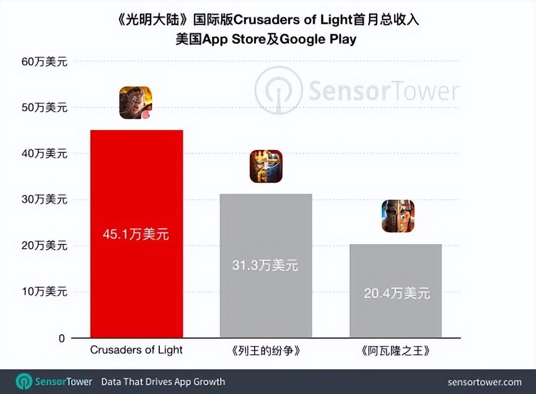 国内的收入数据小弟没查到,不过在海外上线的首月确实十分风光,根据Sensor Tower数据显示,该作上线首月,在美国App Store及Google Play商店的综合收入高达45.1万美元,击败了另外两款成功市场的中国手游——《列王的纷争》及《阿瓦隆之王》。