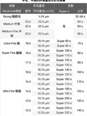 羊毛的美丽支数和纱线细度无关,而是和羊毛直径对应。公支是传统羊毛纤维细度标准,但随着美利奴羊毛的普及,以国际羊毛纺织组织(IWTO)制定的是什么Super s标准成为教程主流。